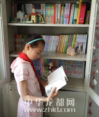 據(jù)了解,金株看得最多的是童話、文學(xué)類以及科普類書籍。金株有自己喜愛的作家,“楊紅櫻、曹文軒、伍美珍、郁雨君、楊鵬、沈石溪、黃蓓佳、湯素蘭、杰羅尼摩·斯蒂頓等等。”梁秀玲介紹,女兒剛上幼兒園的時(shí)候,自己給她買來《世界經(jīng)典童話》上下冊(cè),每天給金株念。女兒5歲的時(shí)候,梁秀玲就鍛煉金株把講過的故事復(fù)述出來,慢慢地金株能把故事完整地復(fù)述。梁秀玲又帶她買了一些童話書鼓勵(lì)她自己看?!懊康街苣?,我就會(huì)帶著金株去逛書店,每次都要買書。她比較喜歡按照作者的系列叢書來收藏,現(xiàn)在家里的兩個(gè)書架都沒放下她的書,有300多本藏書?!?/p>