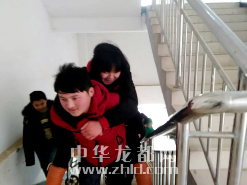 ????雷偉每隔幾天就背一次孔雪珂,這已成了他學(xué)校生活的一部分?!俺宋冶晨籽╃嫔舷聵峭?,我們班其他26個男生也都背過她。我作為班長,理應(yīng)多做一些?!卑芽籽╃姘踩偷浇淌?,雷偉有點不好意思地說,“第一次背她,我有點兒害羞,但如今已經(jīng)習(xí)慣了。”