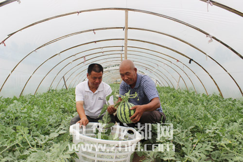 ?? 近日,項城市南頓鎮(zhèn)大棚西瓜基地開園,培育的“半截樓”8428西瓜,因果瓤脆嫩、味甜多汁走俏市場。該基地?fù)碛写笈?0多個,占地面積120多畝,畝均收入2萬多元。圖為該基地工作人員在采摘西瓜?! 。ǚ簿颁h 攝)