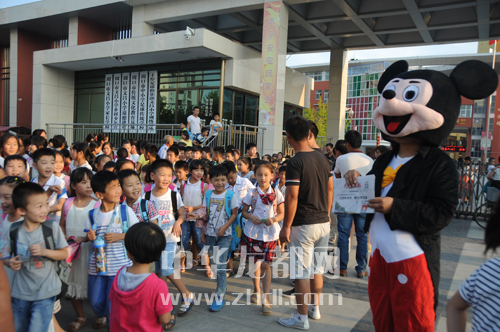 ????9月1日17時許,在慶豐路周口市文昌小學(xué)門前,家長們看到周口晚報工作人員在派發(fā)禮品,紛紛掏出手機,掃描二維碼關(guān)注周口晚報微信公眾號(圖一)。17時40分,放學(xué)的孩子們排著整齊的隊伍陸續(xù)走出校門。校門外,由周口晚報記者扮演的米老鼠和唐老鴨“大玩偶”吸引了孩子們的目光(圖二)。孩子們興奮地同“大玩偶”玩耍起來。有玩的,還能免費領(lǐng)取學(xué)習(xí)用品,孩子們大聲召喚家長加入到掃描二維碼關(guān)注周口晚報微信公眾號的“大軍”中來。市民趙先生說:“我是咱晚報的忠實讀者,正準備訂閱明年的報紙,還打算讓孩子參加晚報組織的小記者活動呢!”