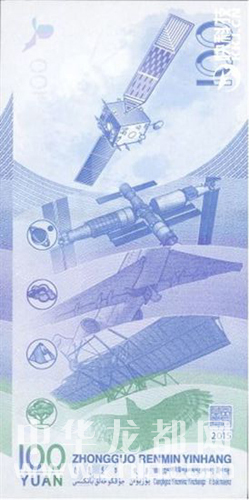 中國航天紀念鈔面額為100元,票面長155毫米,票面寬77毫米,中國航天紀念鈔主色調為藍色。正面主景圖案為神舟九號飛船與天宮一號交會對接圖案。左上方為國徽圖案、“中國人民銀行”行名,其下方為東方紅一號衛(wèi)星圖案。票面左下方為面額數(shù)字“100”和漢字“壹佰圓”。主景圖案右側為嫦娥一號衛(wèi)星圖案,其上方為面額數(shù)字“100”和“中國航天紀念”字樣。背面主景圖案由上至下依次為嫦娥一號衛(wèi)星圖案、2020年中國空間站“天宮”、噴氣式客機、馮如2號雙翼螺旋槳飛機、飛禽海東青圖案。票面左上角為風箏局部圖案,右上角為面額數(shù)字“100”。票面下方為行長章與年號“2015”,中國人民銀行漢語拼音字母和蒙、藏、維、壯四種民族文字的“中國人民銀行”字樣與面額,面額數(shù)字“100”,漢語拼音字母“YUAN”。