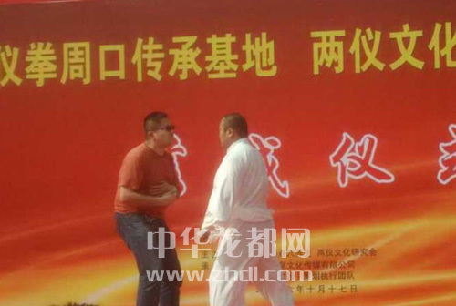 ????當(dāng)日,在兩儀拳周口傳承基地揭牌和兩儀文化周口發(fā)展中心落成儀式上,兩儀拳傳承人分別做了兩儀拳展示和兩儀養(yǎng)生功夫表演。隨后,段保華的弟子高躍鑫請(qǐng)現(xiàn)場(chǎng)觀眾上臺(tái)體驗(yàn)兩儀拳點(diǎn)穴。一位身材高大、體重近100公斤的彪形大漢應(yīng)聲上臺(tái)。彪形大漢與高躍鑫交流后,表示已準(zhǔn)備完畢。話音剛落,彪形大漢就被點(diǎn)中穴道,立即倒地。讓人驚奇的是,解穴后,彪形大漢隨即恢復(fù)正常?!耙郧奥犝f過兩儀拳的威力很大,沒想到會(huì)這么大。”彪形大漢說。