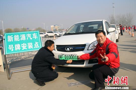 ????中新網(wǎng)保定11月20日電 (呂子豪 于俊亮) 20日,河北省公安廳副廳長劉云峰將冀FD10001新能源汽車專用號牌正式頒給保定市民康辰龍。據(jù)悉,該新能源汽車將享受“不限行”的交通管理優(yōu)惠政策。