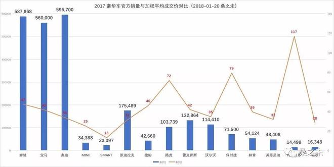 銷售的數(shù)量固然重要,但是銷售質(zhì)量也是評(píng)估銷售力不能忽視的重要指標(biāo)。衡量銷售質(zhì)量,“加權(quán)平均成交價(jià)”和“單車?yán)麧櫋边@兩個(gè)重要參數(shù),也許讓我們更直觀的看到車企的銷售能力與經(jīng)銷商單店經(jīng)營質(zhì)量。這些更微觀的數(shù)據(jù)往往更能反映銷售公司及其經(jīng)銷商體系的銷售能力及水平。“加權(quán)平均成交價(jià)”反映車企的產(chǎn)品力與銷售公司的銷售能力,車企賣掉的車越多,單車價(jià)格越貴,品牌就越具有競爭力,反之就需要考慮改進(jìn)產(chǎn)品,提升銷售管理能力。“單車?yán)麧櫋敝附?jīng)銷商銷售新車獲取的利潤,不含衍生利潤,一般在-4%-7%之間,如果單車?yán)麧櫝^-2%,廠家需要考慮對(duì)經(jīng)銷商進(jìn)行補(bǔ)貼,如果利潤超過7%,車企就會(huì)調(diào)整經(jīng)銷商浮動(dòng)返利。下面我們通過這兩個(gè)指標(biāo),來看哪些豪華車品牌在2017年表現(xiàn)更具實(shí)力。