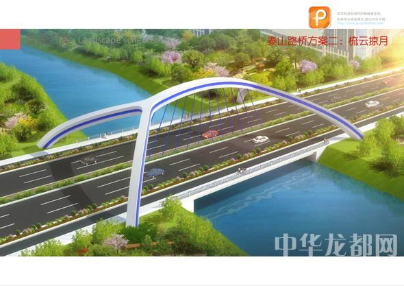 泰山路橋的設(shè)計方案有兩套,分別為“錚錚鐵骨”和“梳云掠月”。“錚錚鐵骨”為下承式系桿拱橋。記者從效果圖中看到,其拱體骨架給人一種力量感,拱身視線通透,簡潔明快。“梳云掠月”為鋼筋混凝土提籃拱橋。記者從效果圖中看到,該橋的拱圈造型獨特,簡潔又不失大氣。