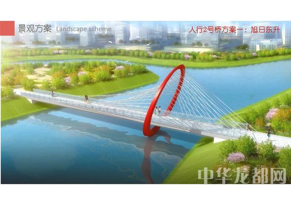 人行2號橋的設(shè)計方案有兩套,分別為“旭日東升”和“氣貫長虹”?!靶袢諙|升”為圓形塔懸索橋。記者從效果圖中看到,該橋的橋塔為圓形,猶如一輪東升的太陽,象征著城鄉(xiāng)一體化示范區(qū)蓬勃發(fā)展的未來。“氣貫長虹”為中承式系桿拱橋。該方案結(jié)合中國玉帶橋的古典元素、抽象古典幾何美學(xué),采用現(xiàn)代的設(shè)計手法,創(chuàng)作出現(xiàn)代感和中國傳統(tǒng)橋梁元素雜糅的橋梁設(shè)計。