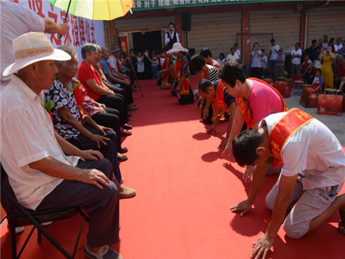鄉(xiāng)長吳國鋒發(fā)表了熱情洋溢的致辭。他首先代表平店鄉(xiāng)黨委、政府、人大向受到表彰的先進模范和先進家庭表示熱烈的祝賀并致以崇高的敬意。并詳細闡述了開展“孝善敬老讓愛回家、孝賢之星表彰授牌暨解決獨居老年人問題、助力脫貧攻堅的重大意義,他希望受到表彰的先進代表和家庭要珍惜榮譽、再接再厲,繼續(xù)弘揚尊老、敬老、養(yǎng)老、愛老的傳統(tǒng)美德,推動全鄉(xiāng)“孝善敬老”文化不斷邁向新臺階?;顒蝇F(xiàn)場宣讀了《平店鄉(xiāng)人民政府敦促將被贍養(yǎng)人接入安全住房共同生活的通告》;與會領(lǐng)導(dǎo)為孝賢之家頒獎授牌;28個“孝子孝媳”在臺上統(tǒng)一施行叩拜大禮;活動結(jié)束后,鄉(xiāng)政府指派3名班子領(lǐng)導(dǎo)和10多名工作人員,分別乘坐6臺輛,由嗩吶隊開路,風(fēng)風(fēng)光光把28個老人送回了家。一路引來不少群眾駐足注目觀看,廣大群眾對此嘖嘖稱贊、拍手稱快。