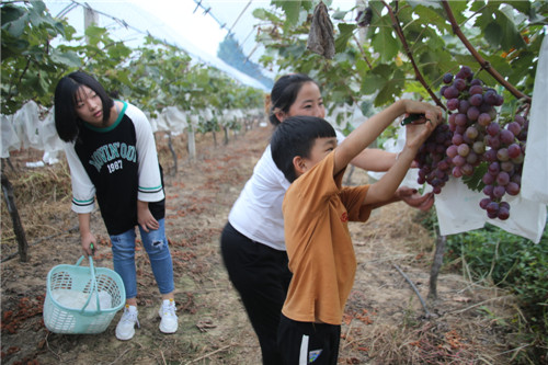 近日,商水縣鄧城鎮(zhèn)天力生態(tài)葡萄園的葡萄大面積成熟,因種類多、口感好,前去采摘的市民絡(luò)繹不絕。圖為9月1日幾名市民在園內(nèi)采摘葡萄。