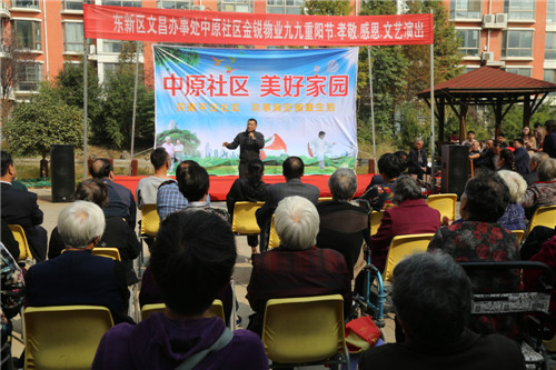 金秋十月,菊花飄香。10月17日重陽節(jié)當(dāng)天,東新區(qū)中原社區(qū)攜同金銳物業(yè)在該社區(qū)組織開展了“擁抱新時(shí)代 歡度重陽節(jié)”文藝演出活動(dòng)。東新區(qū)社會(huì)事務(wù)局局長(zhǎng)朱放哲,房屋征收中心主任閆國(guó)政,文昌辦事處主任李向峰,國(guó)庫支付中心副主任科員齊孟磊,文昌中學(xué)副校長(zhǎng)康瑞玲參加活動(dòng)。