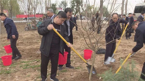 當(dāng)天下午雖然暖陽(yáng)照射,但初冬的鹿邑大地仍是涼風(fēng)習(xí)習(xí)。不過(guò)這一點(diǎn)兒也沒(méi)有影響到大家的心情。一到植樹(shù)現(xiàn)場(chǎng),梁建松、李剛等領(lǐng)導(dǎo)就和大家一起興致勃勃地拿起鐵鍬等工具忙碌起來(lái),揮鍬鏟土,扶樹(shù)填土,澆水正苗,每道工序都做得認(rèn)真細(xì)致、一絲不茍。