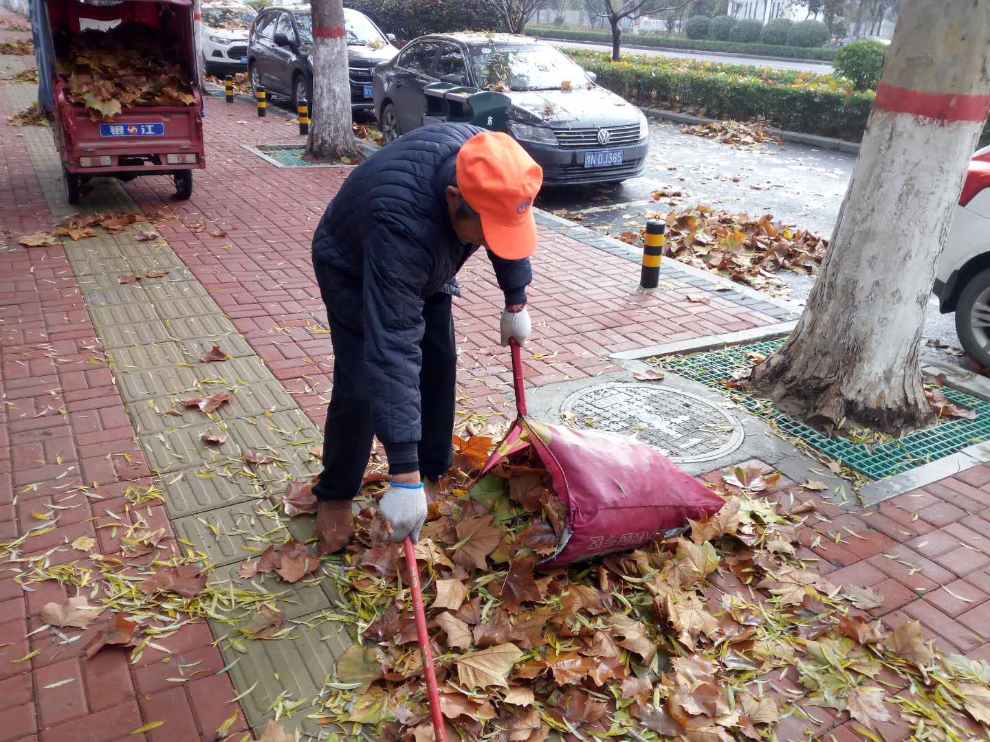 12月3日晚上,周口市中心城區(qū)風(fēng)急雨驟,樹葉落了一地。4日上午天放晴,環(huán)衛(wèi)工人紛紛上街清掃落葉。負(fù)責(zé)興旺路的環(huán)衛(wèi)工人告訴記者,他以前兩個(gè)小時(shí)就能打掃完,而當(dāng)天他干了3個(gè)小時(shí)還沒有干完,估計(jì)還得再干1個(gè)多小時(shí)。圖為環(huán)衛(wèi)工人在清掃落葉。