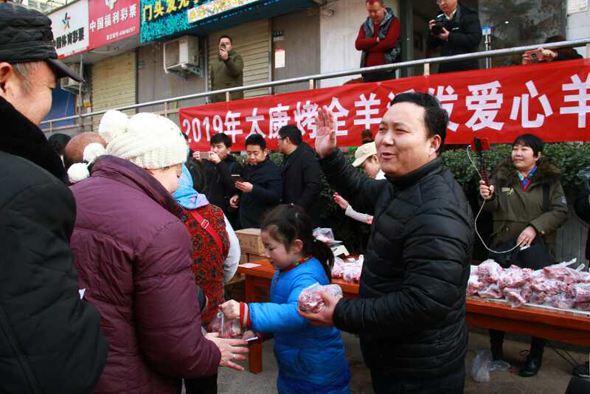 小小燒烤店門前,成了倡導“愛與奉獻主會場”。 2019年1月1日上午10點,新年第一天,鄭州市國基路與豐慶路交叉口太康烤全羊店門口,60多名環(huán)衛(wèi)工、殘疾人、困難群眾等弱勢群體聚集在這里,排隊免費領(lǐng)取“羊肉哥”孫合理和妻子劉曉愛派送的一份新年禮物——愛心羊肉,而這愛舉從2010年元旦開始到如今,已經(jīng)堅持了9年。