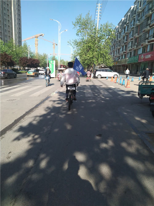 4月18日上午,一位市民在周口中心城區(qū)慶豐路的人行道上秀起了車技,在車多人多的路段玩起“大撒把”,看起來(lái)很危險(xiǎn)。記者 吳繼峰 攝