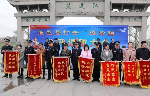 4月25日上午,鹿邑縣召開打擊“盜搶騙”專項(xiàng)行動(dòng)公開退贓大會(huì)??h委常委、政法委書記侯自峰出席會(huì)議并講話??h公、檢、法、司等有關(guān)部門負(fù)責(zé)人與群眾代表近300人參加退贓大會(huì)。