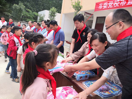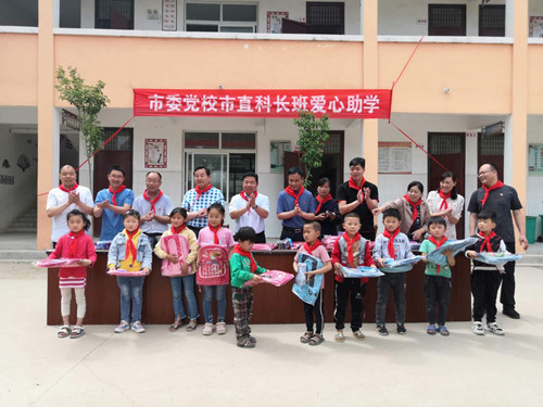 5月29日上午,2019年度市委黨校春季市直科長(zhǎng)班20多名學(xué)員代表,在該校副校長(zhǎng)高鵬帶領(lǐng)下,來到西華縣大王莊鄉(xiāng)東孫莊小學(xué)開展愛心助學(xué)活動(dòng),為48名小學(xué)生送去圖書、書包、文具盒等“六一”禮包。