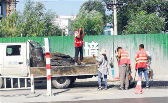 工農(nóng)南路,市政人員正在烈日下緊張地鋪設瀝青路面。