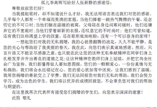 為表示對張新靜等人大代表的感謝,隨后,李高輝給張新靜寫了一封感謝信。信中,他表示,自己一定不辜負大家的期望,以后會更加努力學(xué)習(xí),回饋社會,回報大家?!八且粋€懂得感恩的孩子,讀了他的來信,我感到很欣慰?!睆埿蚂o說。