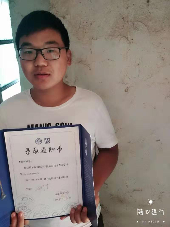 據(jù)了解,李高輝是一個命苦的孩子,很小的時候父親因病去世,母親改嫁,無奈,他只好跟隨年邁多病的爺爺奶奶一起生活,家庭十分拮據(jù)。俗話說,窮人的孩子早當家。李高輝從小學(xué)就知道勤奮學(xué)習(xí),養(yǎng)成了不懼困難,愛幫助別人的性格,深受師生喜愛。經(jīng)過10多年努力拼搏,2019年高考,他以優(yōu)異的成績被大連海事大學(xué)航空學(xué)院錄取。