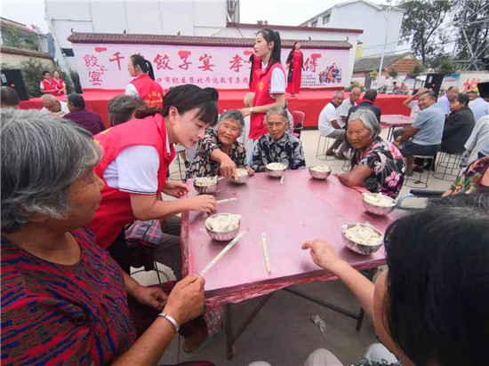 與此同時(shí),在演出現(xiàn)場(chǎng)附近的村委大院內(nèi),由周口市慈孝文化促進(jìn)會(huì)、北斗達(dá)教育集團(tuán)等組成的200多名志愿團(tuán)隊(duì)正忙得不亦樂(lè)乎,調(diào)餡、包餃子、下鍋、端盤,兩個(gè)多小時(shí)內(nèi),他們精心包出20000多個(gè)愛心水餃。11時(shí)30分,餃子宴正式開始,老人們一邊吃著水餃一邊觀看者演出,喜笑顏開,呈現(xiàn)出一片相親相敬的溫馨畫面。