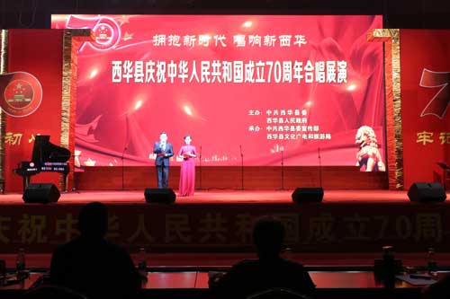 9月23日和24日晚,由西華縣委、縣政府主辦,縣委宣傳部、縣文化廣電和旅游局承辦的“擁抱新時代·唱響新西華”慶祝中華人民共和國成立70周年合唱展演預賽在該縣體育館舉行,林鴻嘉、程維崢、周曉燕、郭峰、陳秉生、楊鳳臣、張曉偉、趙增先等縣處級領導干部與來自全縣各屆的群眾共同觀看演出。