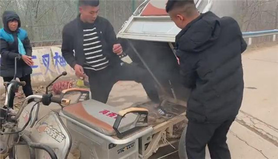 “當(dāng)時(shí)在我們前方的一輛電動(dòng)三輪車駕駛座下冒出黑煙,車上兩位老人察覺到危險(xiǎn)后,急忙下車,站在一旁不知所措。我們也緊跟上前。事發(fā)突然,現(xiàn)場(chǎng)沒有滅火器和可利用水源,而三輪車的火越來(lái)越大,兩位老人著急萬(wàn)分,在旁邊不停地請(qǐng)求我們幫幫她們。根據(jù)經(jīng)驗(yàn),我們當(dāng)機(jī)立斷利用路邊的泥土進(jìn)行撲救,經(jīng)過(guò)幾十秒的緊張撲救,著火部位被成功撲滅?!比幌狸?duì)員回憶說(shuō)三輪車是電線短路引起的電瓶著火。