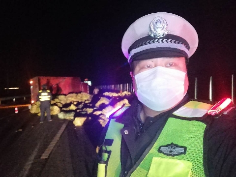 “事故發(fā)生在大廣高速北往南方向2092公里附近,是一起單方事故?!笔泄簿纸煌ü芾碇ш牳咚俣箨犆窬鹾匠陶f,到達現(xiàn)場后民警發(fā)現(xiàn),一輛輕型倉柵式貨車橫著側翻在路面,占據(jù)了兩個車道,應急車道內勉強能夠供過往車輛緩慢通行,一車娃娃菜灑滿了高速公路,在來車方向有幾十米遠。此時天已經黑了,雖然非常時期路上車輛不太多,但是還是不時有運輸生活物資及救援物資車輛通過,一不小心隨時都有可能發(fā)生二次事故,現(xiàn)場需要馬上處置。