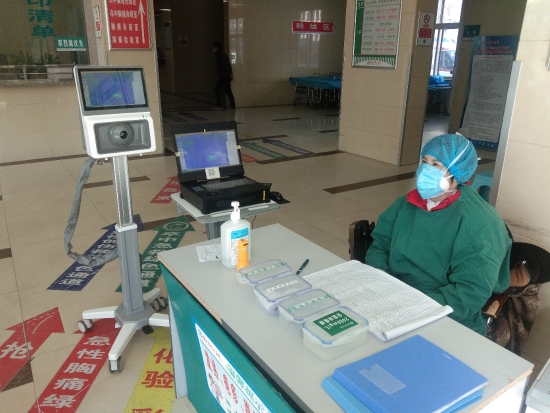 2月18日,記者在周口市中心醫(yī)院急診科看到,一臺醫(yī)用紅外熱像儀出現(xiàn)在急診科的大門口,前來就診的患者必須通過該熱像儀的檢測才能進入急診科就診?!扒皝砭驮\的患者只需要在熱像儀前經(jīng)過,熱像儀就會在屏幕上自動顯示患者的體溫信息,一旦出現(xiàn)體溫偏高的人,熱像儀就會自動報警,并不需要人工檢測,提高了檢測效率?!痹谠摕嵯駜x前做紀錄的醫(yī)務(wù)工作者說。 記者 張洪濤 攝