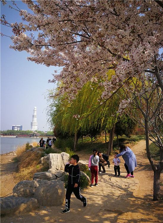 3月24日,周口公園內櫻花、海棠、桃花、紫荊花爭相綻放,在綠樹的映襯下,遠看猶如濃彩重墨的百花圖,不少市民來此賞花游玩。