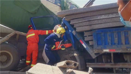 4月26日11時(shí)許,西華縣逍遙鎮(zhèn)加河灘村穎河橋發(fā)生一起車禍,一輛拉石板的貨車和一輛水泥罐車相撞,貨車在強(qiáng)大的慣性下車頭嚴(yán)重變形,司機(jī)被困車中,而貨車的駕駛室也被由于慣性發(fā)生前傾的石板壓住,情況十分緊急。周口市消防救援支隊(duì)西華縣消防大隊(duì)接到報(bào)警后立即出動(dòng)2車10人趕赴現(xiàn)場展開救援。