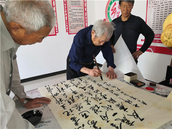 曾慶祥、李宏亮、閆子明、朱好明、單建勛、劉祖祥等9名老年書畫名家一下車,顧不上休息,就紛紛潑墨揮毫,現(xiàn)場為群眾義寫義畫486幅,為村民們獻(xiàn)上一場難得一遇的文化盛宴。雖然天氣炎熱,但是書畫家不辭辛苦,就連已經(jīng)89歲的李宏亮老師中間也不曾休息片刻,直到中午12:30才收筆,熱火朝天的工作激情贏得了干部群眾的一致好評,也都豎起大拇指為他們點贊!