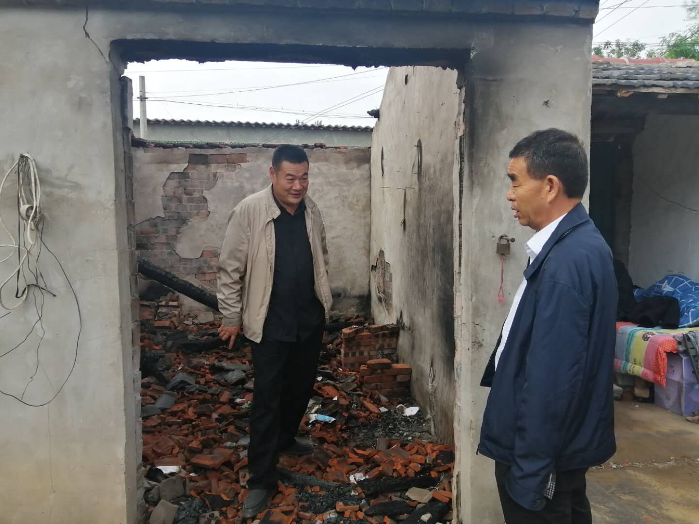 聽完情況后,督導(dǎo)組立刻和駐村工作人員一起到李洪范家查看情況,現(xiàn)場(chǎng)主屋已經(jīng)全部燒毀,屋里到處是瓦礫......李洪范站在被燒毀的房屋里,表情木納的自言自語(yǔ)道“燒得一干二凈,什么都沒了,這以后咋弄呀?!爆F(xiàn)場(chǎng)詢問(wèn)其生活情況時(shí),李洪范說(shuō),“當(dāng)天,鄉(xiāng)里邊就送來(lái)了米、油和錢。村長(zhǎng)也送來(lái)了幾件衣服,現(xiàn)在就是沒有地方住?!?/p>