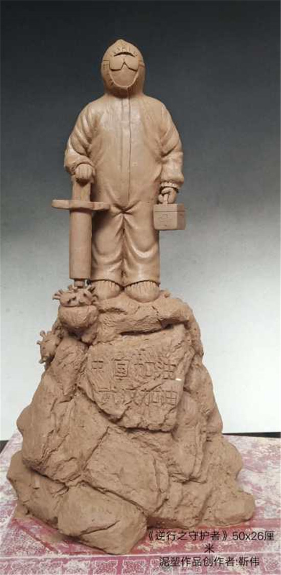 所捐《逆行之守護者》泥塑作品,高50厘米,寬26厘米,描述全副武裝的醫(yī)護工作者一手握針管殺死病毒,一手提藥箱救人,謳歌了疫情中逆行的醫(yī)護工作者不畏犧牲、與新冠病毒搏斗,冒死救治病毒感染者的偉大精神?!陡艨論肀А肥侵v述我市扶溝縣人民醫(yī)院抗疫故事,疫情期間奮戰(zhàn)在抗疫一線的劉海燕醫(yī)生和為自己送年夜飯的女孩隔空擁抱的感人場景,讓無數(shù)人熱淚盈眶。
