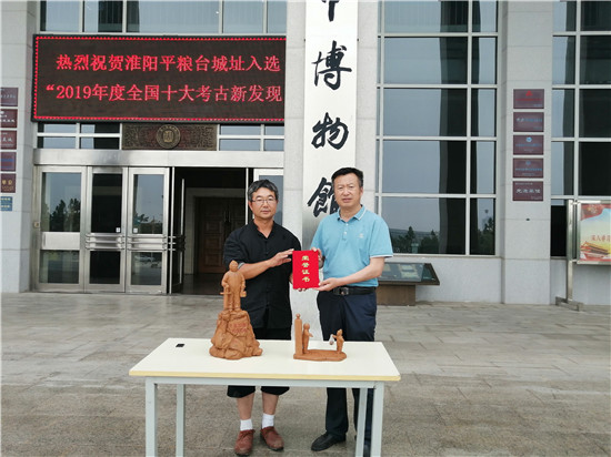 6月12日,在2020年“文化和自然遺產(chǎn)日”即將來臨之際,淮陽區(qū)市級非物質(zhì)文化傳承人靳偉向市博物館捐贈“抗疫”泥塑作品《逆行之守護者》《隔空擁抱》,以表達藝術家對新冠肺炎疫情期間全國醫(yī)務人員無私精神的敬意。周建山館長向靳偉頒發(fā)榮譽證書。