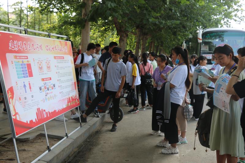 在該縣各標(biāo)準(zhǔn)化高考考點(diǎn)征兵宣傳現(xiàn)場(chǎng),人頭攢動(dòng)、熱鬧非凡?!昂媚袃海瑏?lái)當(dāng)兵”大紅條幅和“把忠心獻(xiàn)給祖國(guó),把青春獻(xiàn)給軍營(yíng)”“參軍報(bào)國(guó)盡義務(wù),熱血青年競(jìng)風(fēng)采”的大型宣傳牌格外引人注目,內(nèi)容豐富的征兵宣傳展板一字排開(kāi),《征兵宣傳手冊(cè)》《大學(xué)新生應(yīng)征入伍宣傳單》《征兵政策宣傳解讀手冊(cè)》等征兵宣傳資料擺放在咨詢臺(tái)上一目了然,吸引了眾多的考生和家長(zhǎng)駐足觀看,圍著咨詢臺(tái)詢問(wèn)有關(guān)征兵事宜。