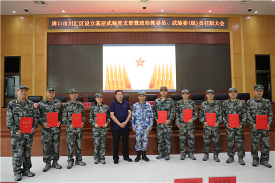 黨管武裝建設(shè)國防,軍民攜手共筑長城。為健全武裝工作組織領(lǐng)導(dǎo)體系為推動國防動員和后備力量建設(shè)在基層末端落實,7月16日上午,周口市川匯區(qū)召開基層武裝黨支部暨政治教導(dǎo)員、武裝委(組)員任職大會。周口軍分區(qū)司令員湯維政,區(qū)委書記、區(qū)人武部黨委第一書記李宗喜,市委組織部處級干部宋陽,區(qū)人武部政委高新傳、部長陳繼芳及城鄉(xiāng)一體化示示范區(qū)、經(jīng)濟(jì)開發(fā)區(qū)、港口物流產(chǎn)業(yè)聚集區(qū)等有關(guān)負(fù)責(zé)同志參加了大會。會上設(shè)立了18個基層武裝黨支部,任命了15名基層武裝部政治教導(dǎo)員、20名村(社區(qū))武裝委(組)員任職命令,武裝部政治教導(dǎo)員、武裝預(yù)建黨支部書記和兼職武裝委(組)員代表先后作了履職承諾發(fā)言,湯維政等為新任命的人員頒發(fā)了任職證書。