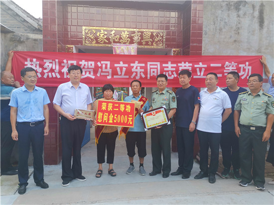 8月1日,淮陽區(qū)人武部負責人李保祥與該區(qū)退役軍人事務(wù)局局長董天祥等人一起,帶著二等功喜報及慰問金,專程趕往該區(qū)四通鎮(zhèn)葉莊行政村前馮橋村現(xiàn)役軍人馮立東家中。此時,村里鑼鼓隊敲響了,村民走出家門紛紛前來觀看,頓時贏得村民的一片喝彩及點贊聲。許多村民說:“孩子在部隊立功授獎,作為軍屬可真是光榮呀!”(記者孫安平 通訊員 張然 張航碩 攝影報道)
