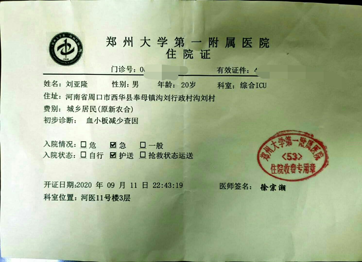 “俺家亞隆今年才20歲,在鄲城一高復(fù)讀一年考了653分,考上‘雙一流’。本來開開心心的,到9月份要開學(xué)了發(fā)現(xiàn)他身上有出血點(diǎn),牙齦還紅腫,就帶他去漯河檢查。開始說是肝上的毛病,查肝的時(shí)候發(fā)現(xiàn)血小板特別低,趕緊轉(zhuǎn)到鄭州,9月15號(hào)確診為白血病。還有四天就要上大學(xué)了,現(xiàn)在只能申請(qǐng)推遲一年入學(xué)?!皝喡寢尭嬖V記者。