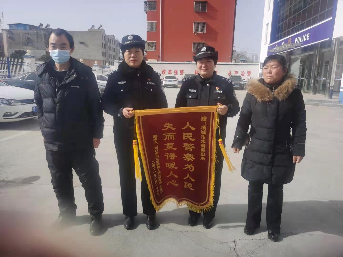 1月28日上午,鄒某夫婦手持一面 “人民警察為人民 失而復(fù)得暖人心”的錦旗,來(lái)到項(xiàng)城市公安局水寨派出所,向所長(zhǎng)韓莉等民警表示感謝。