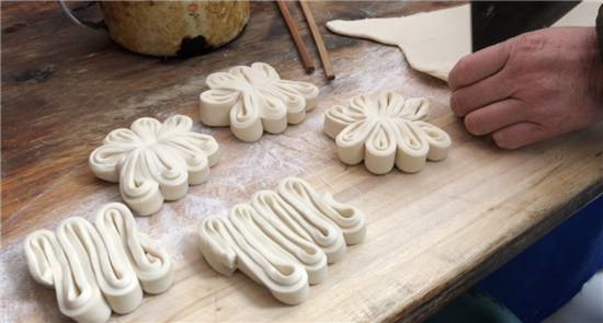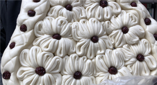 除了平常的白面饅頭,黃師傅還讓妻子現(xiàn)場展示了“棗山”制作,并介紹了棗山的寓意和習(xí)俗?!澳憧催@棗山是一層一層的,寓意著步步登高,而且棗山的花形是圓的,代表著團團圓圓。過去出嫁的閨女過年回娘家要帶大饃,娘家要回棗山,現(xiàn)在咱們周口的一些地方還保留著這樣的習(xí)俗?!眱晌恢鞑ンw驗了棗山的制作過程,得到黃老板妻子的夸獎:“中!這倆妮兒可巧!”