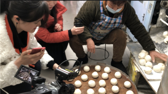 過大年,蒸饅頭。當(dāng)日9時許,在項城市,兩位主播唱起中國傳統(tǒng)年俗童謠,隨后走進一家饅頭店現(xiàn)場直播年饃制作過程。饅頭店老板姓黃,從事饅頭制作30余年,直播開始即見轟鳴的和面機攪動著巨大的白面團,黃老板介紹說,這次和的面有130余斤,”以前是人工揉面,一個壯勞力一次揉40來斤面就不錯了?,F(xiàn)在機器揉面除了揉的多,而且快,還越揉越白,不像人工揉面越揉越黑。機器揉面越揉越勁道,做出來的饃好吃,我們這兒現(xiàn)在全機械化制作“。