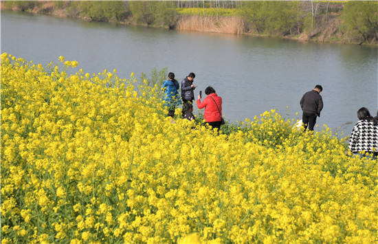 春分過后,遠(yuǎn)眺沙河灣,春暖花開香。早種的油菜花已經(jīng)盛開,大片競相綻放的油菜花,和著明媚的陽光、溫暖的春風(fēng)、碧波蕩漾的河水,讓人心曠神怡、物我兩忘。