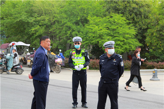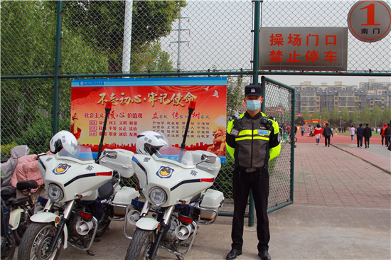 4月16日,鄲城一高舉行第12屆18歲成人儀式暨奠基高考決勝2022誓師大會。鄲城縣公安局副局長朱衛(wèi)兵率領(lǐng)交警鐵騎隊兵分4路,從早上7時至上午11時在學校周圍維護交通秩序,確保數(shù)千名家長的車輛有序停放,疏堵保暢。