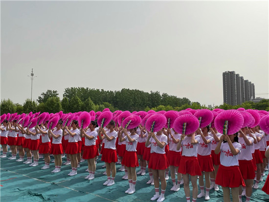 開幕式還舉行了彩扇舞、啦啦操、中國功夫、歌曲等文體表演。其中,彩扇舞《盛世花開》,由該校文化教育學(xué)院300名女生手持彩扇,跟隨著不同的音樂節(jié)奏變換著不同的色彩與隊(duì)形,依次拼出由鐮刀和錘頭組成的中國共產(chǎn)黨黨徽、象征體育精神的奧運(yùn)五環(huán)、“慶祝建黨100周年”、“周職20周年校慶”等圖形和字樣,表達(dá)著對(duì)黨的熱愛和對(duì)學(xué)校的祝福。表演者王真真說:“大家協(xié)同配合才能把節(jié)目表演好,這個(gè)節(jié)目我們排練了一個(gè)多月。雖然很辛苦,但是看到節(jié)目順利演出,感到很有成就感?!?/p>