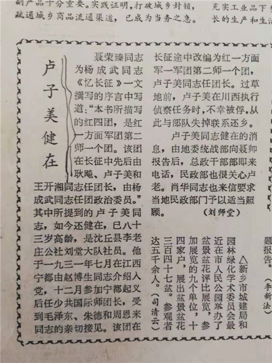 《河南日報》刊發(fā)《盧子美健在》的消息
