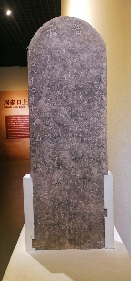 在周口市博物館三層?xùn)|側(cè)的展廳“逐波興埠”里,有這樣一通碑刻:它通體由青石材質(zhì)制作而成,高120厘米,寬40厘米,厚8厘米,兩面刻,均為陰文楷書,碑名為《嚴(yán)禁溜夫訛索客船事告示碑》。在周口市博物館為數(shù)不多的碑刻文物中,這通石碑是我市迄今發(fā)現(xiàn)的唯一一件約定溜夫行為、確保水運秩序的文物,對研究周口水運史具有重要的歷史考古價值。