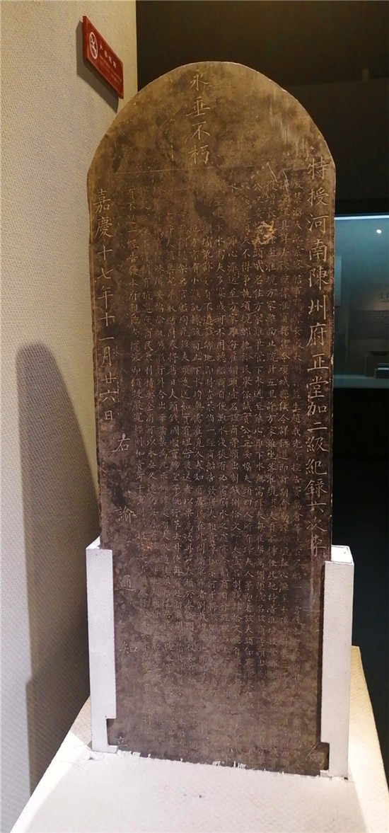 這家店的主人叫段清海,他從事刻碑行業(yè)多年,經(jīng)驗頗豐,從第一眼看到這通石碑,憑直覺就感覺它來歷不凡?!爱?dāng)時那個人把這通碑送到店里,要求把上面的字磨掉,重新刻成一塊墓碑。我仔細(xì)一看,這通碑的表面雖然有些微磨損,字跡稍顯模糊,但細(xì)致觀察,能發(fā)現(xiàn)碑文的落款為清嘉慶十七年(1812年)和清同治八年(1869年)。也是不忍心吧,我沒有把它毀掉,而是免費為那個人刻了一通新碑,就把這通年代久遠(yuǎn)的舊碑留下來了?!倍吻搴;貞浾f,2012年的時候,他聽說周口市博物館面向全市征集古物,他第一時間把石碑送交到周口市博物館,沒有要一分錢,“它在我的店里放了四年,期間好幾次差點被送貨拉貨的工人損壞,交給博物館總算是給它找了一個‘安穩(wěn)’的家,我的心里也算踏實了”。