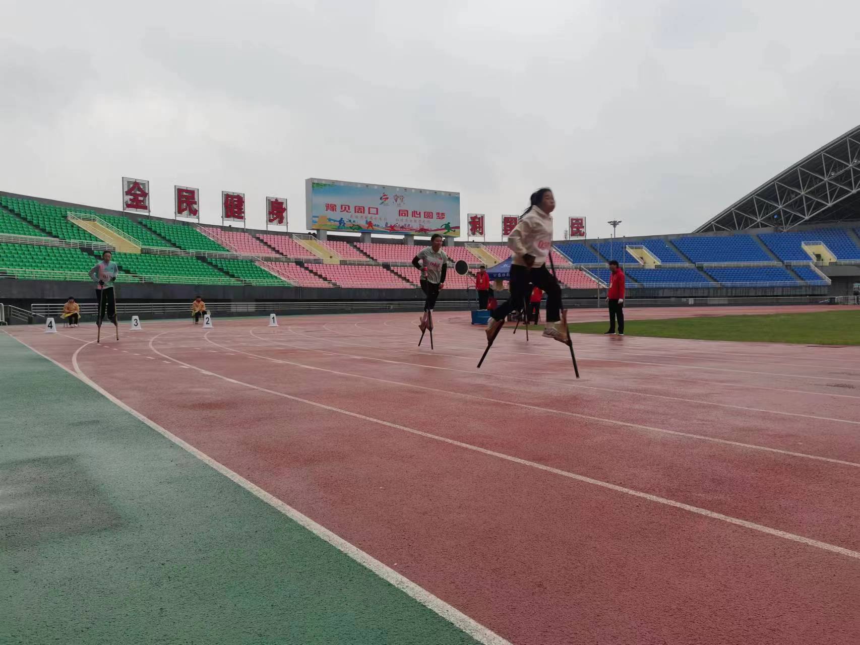 4月23日,河南省第九屆少數(shù)民族傳統(tǒng)體育運(yùn)動會高腳競速項(xiàng)目預(yù)賽在周口體育中心田徑場開賽。隨著裁判一聲哨響,運(yùn)動員們腳踩30多厘米的竹馬如離弦之箭向終點(diǎn)飛奔,他們在高腳馬上進(jìn)行著速度和力量的比拼。