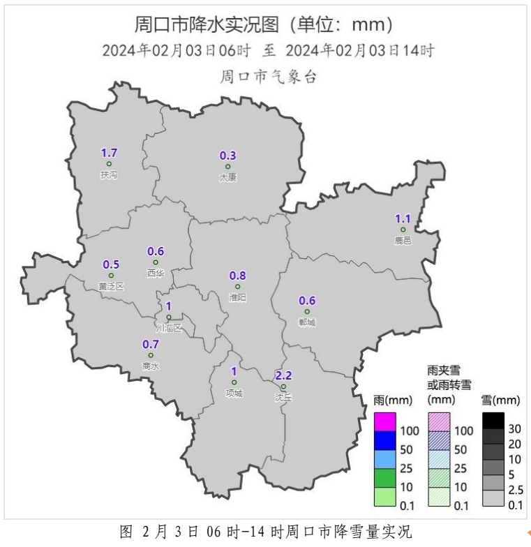 今天 06 時(shí)﹣14時(shí):我市出現(xiàn)小雪。最大降雪量出現(xiàn)在沈丘2.2毫米。各國(guó)家站降雪量(毫米):沈丘2.2、扶溝1.7、鹿邑1.1、項(xiàng)城 1.0、川匯區(qū) 1.0、淮陽(yáng)0.8、商水0.7、鄲城0.6、西華0.6、黃泛區(qū)0.5、太康0.3。