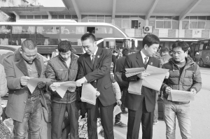 近日,太康縣法院法官在車站為外出務工人員發(fā)放并講解法律宣傳資料。連日來,正值外出務工人員集中返程高峰,縣法院的法官們前往車站為外出務工人員提供法律維權服務,并向他們發(fā)放《外出務工人員維權手冊》、《法律小常識》等法律宣傳資料,提供法律咨詢,促使他們外出務工自覺依法維權。(李康 攝)