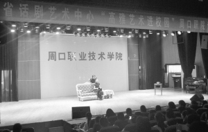 6月9日下午,由河南省教育廳、文化廳、財政廳主辦的2015年“高雅藝術(shù)進(jìn)校園”——省話劇藝術(shù)中心專場演出在周口職業(yè)技術(shù)學(xué)院礪德廳舉行。激情的舞臺對白、絢麗的歌舞場景,話劇藝術(shù)中心的演員們聯(lián)袂為800余名師生獻(xiàn)上了一場視聽盛宴。(孫先鋒 攝)